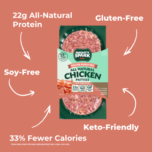 Mighty Spark makes healthy protein taste delicious! Lean, all-natural chicken- combined with diced bacon - makes for a perfect healthy burger option that's delicious on a bun or as a salad topper. At 22 grams of protein per burger patty, the Bacon-Bursting Chicken Patties will leave you satisfied for hours.