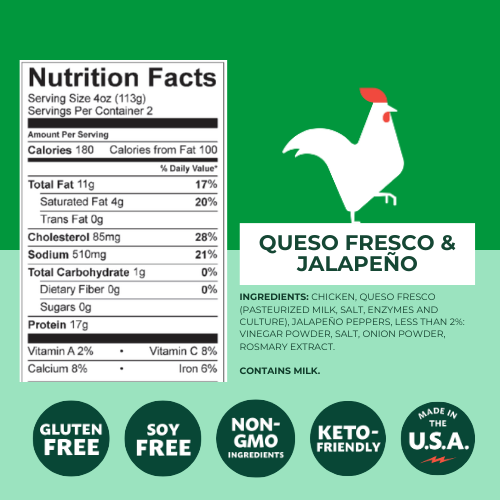 Our Queso Fresco Jalapeño Chicken Patties are packed full of tasty ingredients for the ultimate lean protein experience. Whether you grill these patties and serve them on a bun or sauté them for your favorite salad, you’re sure to get something amazing on the table in no time.