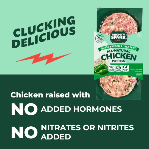 Mighty Spark makes healthy protein taste delicious! All-natural chicken, paired with creamy queso fresco cheese and diced jalapeno, makes this the most delicious, lean burger.